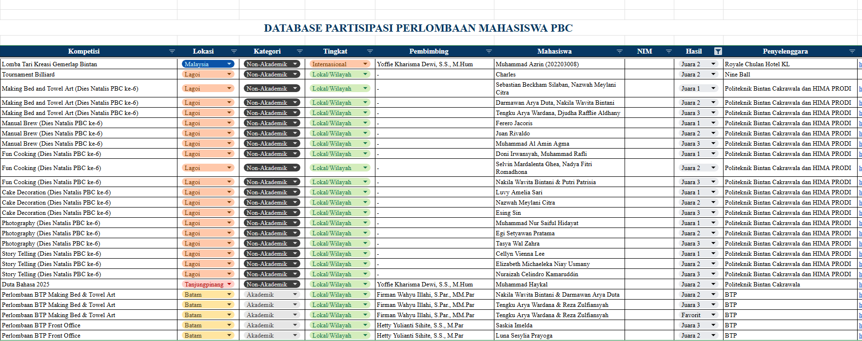 DATABASE PARTISIPASI PERLOMBAAN MAHASISWA PBC - Google Spreadsheet